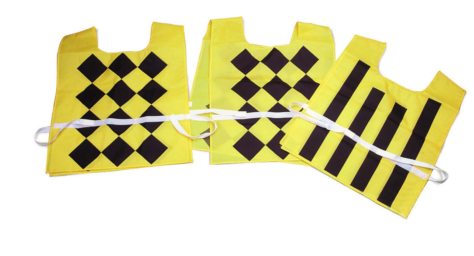 Enhance visibility on the field with these vibrant linesman’s vests. Featuring bright yellow/gold with distinct black markings, each set includes two diamond-marked vests for chain sets and one striped for down box. Secure fit ensured with adjustable Velcro® closures.